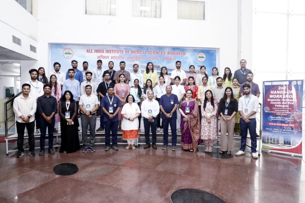 नेशनल वन हेल्थ प्रोग्राम फॉर प्रिवेंशन एंड कंट्रोल ऑफ जूनोटिक डिजीजेस (एन.ओ.एच.पी-पी.सी.जेड) और वायरल रिसर्च एंड डायग्नोस्टिक लेबोरेटरी (वी.आर.डी.एल) के संयुक्त तत्वावधान में एम्स ऋषिकेश में आयोजित कार्यशाला में विभिन्न राज्यों से आए एम.एस.सी व पीएचडी छात्रों सहित बड़ी संख्या में शोधार्थी और रिसर्च स्काॅलर्स शामिल हुए। कार्यक्रम का उद्देश्य प्रतिभागियों को जूनोटिक एवं वायरल रोगों की डायग्नोस्टिक तकनीकों में व्यावहारिक प्रशिक्षण देना था। ’हैंड्स ऑन वर्कशाॅप फाॅर डायग्नोस्टिक टेक्नीक ऑफ जूनोटिक एण्ड वायरल पैथोगन’ विषय पर आधारित इस कार्यशाला को संबोधित करते हुए मुख्य अतिथि संस्थान की कार्यकारी निदेशक प्रो. मीनू सिंह ने वन हेल्थ अवधारणा पर जोर दिया। उन्होेंने कहा कि आज के वैश्विक स्वास्थ्य संकटों के संदर्भ में मानव, पशु और पर्यावरण के स्वास्थ्य को एक साथ देखने की आवश्यकता है। कहा इस प्रकार की कार्यशालाओं से प्रतिभागियों को न केवल व्यावहारिक अनुभव मिलता है अपितु इससे सार्वजनिक स्वास्थ्य प्रणाली भी सुदृढ़ होती है।