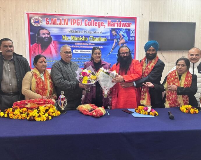 भारतीय महिला हाकी टीम की सदस्य मनीषा चौहान का स्वागत कियाएसएमजेएन कालेज की पूर्व छात्रा हैं मनीषा चौहानहरिद्वार, 19 दिसम्बर। भारतीय महिला हॉकी टीम की सदस्य एवं एसएमजेएन कालेज की पूर्व छात्रा मनीषा चौहान का अखाड़ा परिषद एवं कालेज प्रबंध समिति के अध्यक्ष श्रीमहंत रविंद्रपुरी महाराज, प्राचार्य प्रो.सुनील कुमार बत्राContinue Reading