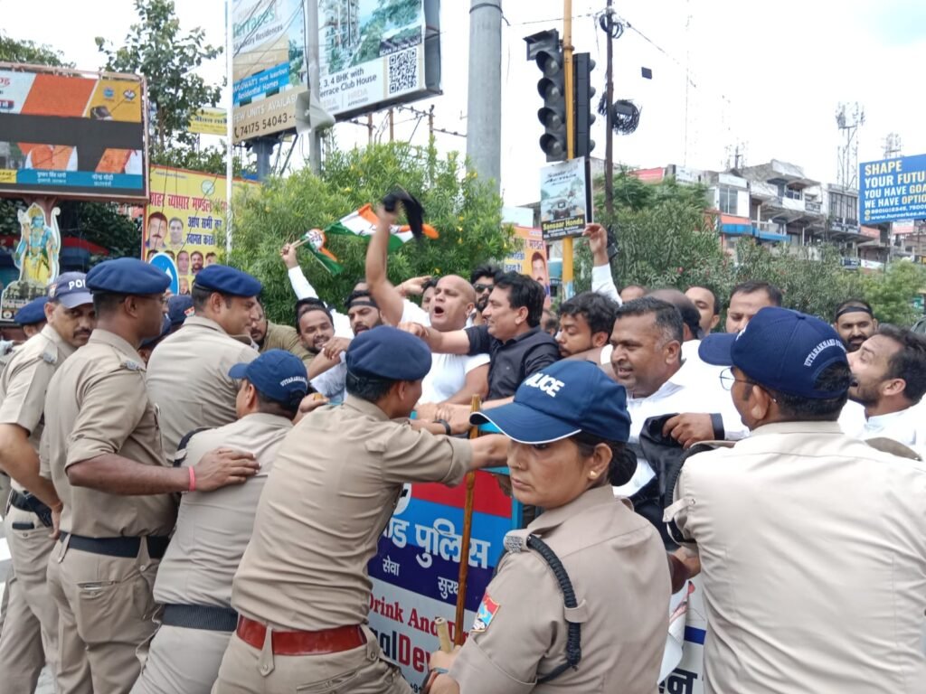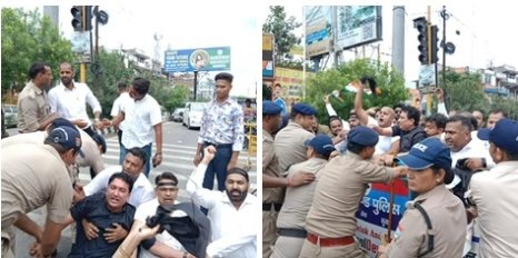 पुलिस द्वारा चंद्राचार्य चौक पर बैरिकेटिंग कर कार्यकर्ताओं को रोकने का प्रयास किया जहां पुलिस और कार्यकर्ताओं में तीखी नौकझौक के बाद पुलिस द्वारा कार्यकर्ताओ को गिरफ्तार कर रोशनाबाद पुलिस लाईन ले जाया गया।