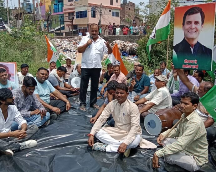बरसाती नाले में उतरकर कांग्रेसियों ने किया धरना प्रदर्शन,ढोल थालियां बजाकर किया विरोध