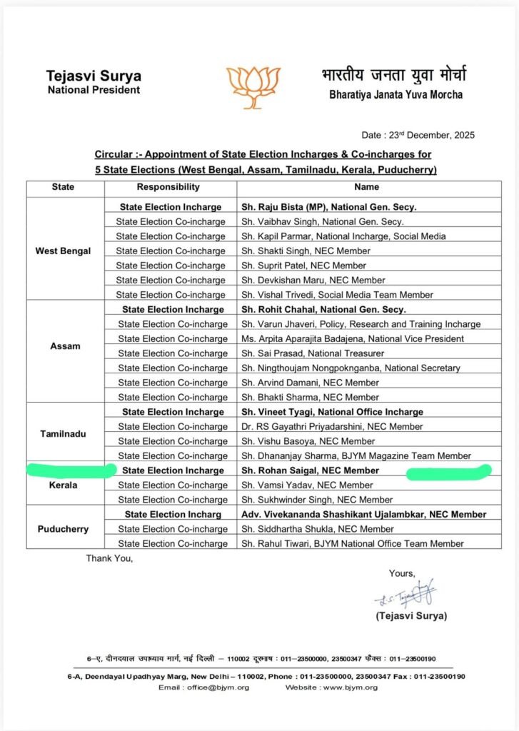 भारतीय जनता युवा मोर्चा (BJYM) ने उत्तराखंड से राष्ट्रीय कार्यकारिणी सदस्य रोहन सहगल को आगामी केरल चुनावों के लिए प्रभारी नियुक्त किया गया है।