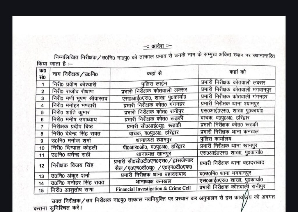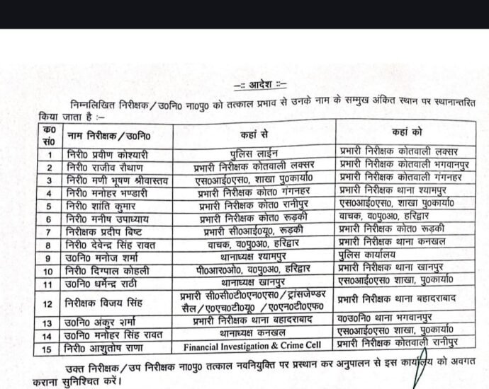 हरिद्वार पुलिस कप्तान प्रमेंद्र सिंह डोबाल ने थाने-कोतवालियों के बदले प्रभार, 11 इंस्पेक्टर और 4 दारोगाओं को किया इधर से उधर