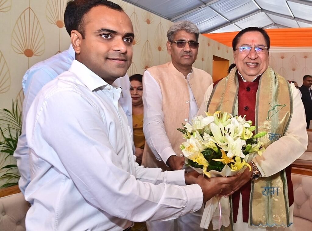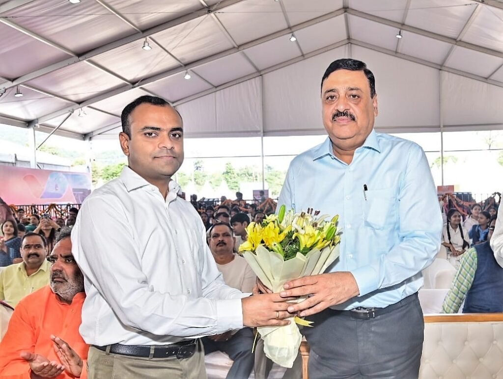 मुख्य अतिथि राज्यसभा सांसद नरेश बंसल का जिलाधिकारी मयूर दीक्षित ने पुष्पगुच्छ भेंट कर किया स्वागत।