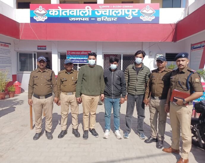 धोखाधड़ी के आरोपी को गिरफ्तार करने आयी यूपी पुलिस पर हमला करने वाले 3 आरोपियों को ज्वालापुर कोतवाली पुलिस ने गिरफ्तार कर लिया है। आरोपी के बेटे ने साथीयों के साथ दबंगई दिखाते हुए यूपी पुलिस के वाहन पर हमला कर दिया था। पुलिस ने आरोपियों के कब्जे से घटना में प्रयुक्त थार और स्कॉर्पियो भी बरामद की है। घटना में शामिल अन्य आरोपियों की तलाश की जा रही है। 3 फरवरी को मुजफ्फरनगर के थाना छपार के एसआई अनुराग सिंह टीम के साथ धोखाधड़ी के मामले में वांछित अभियुक्त संजय पुत्र राजपाल को ज्वालापुर से गिरफ्तार कर ले जा रहे थे। इसी दौरान भूमानंद अस्पताल के पास आरोपी के पुत्र ईशान्त ने अपने पिता को छुड़ाने की कोशिश में अपने साथियों के साथ मिलकर पुलिस के वाहन पर स्कॉर्पियो और थार गाड़ियों से टक्कर मारकर जानलेवा हमला कर दिया। घटना में पुलिस टीम घायल हो गयी और वाहन भी क्षतिग्रस्त हो गया। यूपी पुलिस पर हमले की सूचना पर मौके पर पहुंचे एसएसआई खेमेन्द्र गंगवार, एसआई रविंद्र जोशी, कांस्टेबल मनोज डोभाल, भागचंद व ताजवर चौहान ने तीन आरोपियों ईशान्त पुत्र संजय, शिवम मलिक पुत्र अनुज मलिक व अमन पुत्र गजेंन्द्र निवासी सुभाष नगर ज्वालापुर को गिरफ्तार कर लिया और घटना में प्रयुक्त वाहनों को कब्जे में ले लिया।