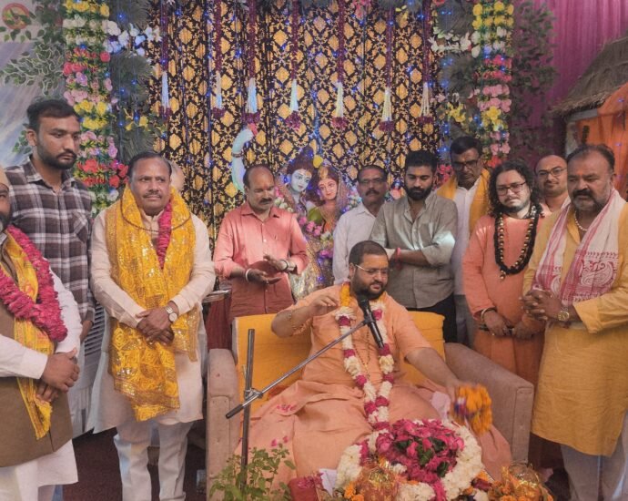 हरिद्वार 18 जुलाई। श्री अखंड परशुराम अखाड़े की और से जिला कारागर रोशनाबाद में आयोजित श्री शिव महापुराण कथा के सातवें दिन कथाव्यास महामंडलेश्वर स्वामी रामेश्वरानंद सरस्वती महाराज ने गणेश जन्म कथा का श्रवण कराते हुए बताया कि एक समय स्नान के लिए जाते समय माता पार्वती ने हल्दी के उबटन से एक पुतला बनाया। जो माता पार्वती की शक्ति से बालक के रूप में प्रकट हो जाता है। माता पार्वती ने उसका नाम गणेश रखा और उसे पहरा देने के लिए द्वार पर बैठा दिया। जब भगवान शिव आए तो बालक गणेश ने उन्हें अंदर जाने से रोक दिया। इस पर शिवजी क्रोधित हो गए और उन्होंने त्रिशूल से गणेश का सिर काट दिया। बाद में पार्वती के क्रोधित होने पर शिवजी ने हाथी का सिर काटकर गणेश के धड़ से जोड़कर उन्हें पुनर्जीवित कर दिया। लेकिन माता पार्वती का क्रोध शांत नही हुआ और वे कहने लगी कि मेरे सुंदर बालक को कुरूप बना दिया। तब सभी देवताओं ने गणेश को आशीर्वाद दिया कि सबसे पहले गणेश की पूजा की जाएगी। गणेश पूजा के बाद ही अन्य देवी देवता पूजन स्वीकार करेंगे। तब से सर्वप्रथम गणेश पूजन के बाद ही अन्य देवी देवताओं का पूजन किया जाता है। कथाव्यास ने कहा कि जो भक्त शिव महापुराण कथा के इस प्रसंग का श्रवण करते हैं। उनकी समस्त मनोकामनाएं गणेश जी पूर्ण करते हैं। इस अवसर पर श्री अखंड परशुराम अखाड़े के राष्ट्रीय अध्यक्ष पंडित अधीर कौशिक, राष्ट्रीय प्रवक्ता भागवताचार्य पंडित पवनकृष्ण शास्त्री, जेल अधीक्षक मनोज आर्य, आचार्य विष्णु शर्मा, आचार्य संजय शर्मा, जलज कौशिक, विष्णु गौड़, राज्य मंत्री ओमप्रकाश जमदग्नि, मनोज गौतम, रूपेश कौशिक, मुकेश कुमार, साहिल गौतम, दीपक कुमार, सुधीर रोहिल्ला, बृजमोहन शर्मा, कुलदीप शर्मा, मनोज ठाकुर, सत्यम शर्मा, मनोज तिवारी, रोहित शर्मा, राकेश कुमार आदि ने व्यास पूजन किया और कथा श्रवण का लाभ लिया।