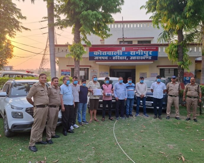 हरिद्वार, 16 मई। रानीपुर कोतवाली पुलिस ने होटल में संचालित किए जा रहे जुए के धंधे का भंडाफोड़ करते हुए 9 जुआरियों को गिरफ्तार कर 2 लाख 19 हजार 700 सौ रूपए की नकदी व ताश की गड्डियां बरामद की हैं। गिरफ्तार किए गए आरोपी गाजिय, मेरठ व बुलंदशहर के रहने वाले है। होटल मैनेजर को भी पुलिस ने हिरासत में लिया है। शिवालिक नगर के पी कलस्टर में होटल डी-ग्लास में जुआ खेले जाने की सूचना पर रानीपुर कोतवाली प्रभारी कमलमोहन भंडारी के नेतृत्व में पुलिस टीम ने होटल में छापा मारा। छापामारी के दौरान पुलिस ने होटल के कमरा नं.201 में जुआ खेल रहे मुनेन्द्र उर्फ बाबी पुत्र किरणपाल सिंह, आदेश त्यागी पुत्र दयाचंद त्यागी, सलमान पुत्र सब्बीर, दिनेश कुमार पुत्र जगपाल सिंह, समय सिंह पुत्र नियादर सिंह, अवधेश कुमार पुत्र दशरथ सिंह, तरूण कुमार पुत्र कैलाशचं, बिजय कुमार पुत्र गजेन्द्र पाल व कुलदीप सिंह पुत्र महेन्द्र सिंह को दबोच लिया।