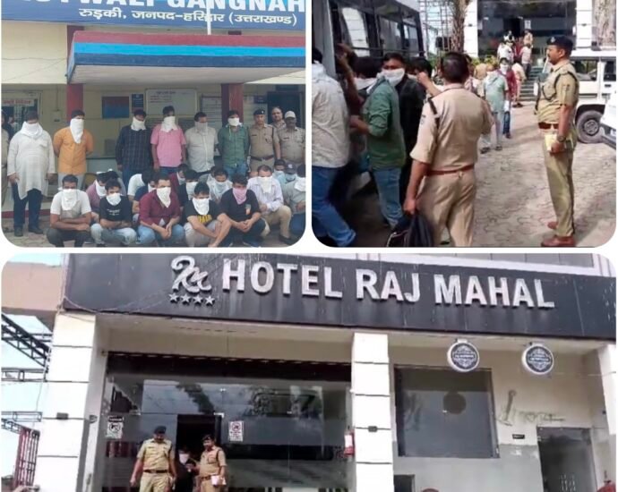 भगवानपुर पुलिस के सहयोग से रामपुर चुंगी स्थित होटल राजमहल में चल रहे बड़े खेल का भंडाफोड़ करते हुए होटल के अंदर से 8 महिलाएं और 24 पुरुषों को हिरासत में लिया है। वहीं मौके से फरार होटल स्वामी सहित अन्य जिनमें एक कथित पूर्व पार्षद भी शामिल है उसकी तलाश की जा रही है। कसीनो की सूचना पर औचक तौर पर होटल में पहुंची पुलिस टीम को देख वहां मौजूद लोगों में हड़कंप मच गया। मौके से कसीनो कॉइन, ताश की गड्ड़ियां, एंट्री कार्ड व दो लाख 74 हजार के करीब नगदी सहित अन्य समान बरामद किया गया। हिरासत में लिए गए आरोपियों को माननीय न्यायालय पेश किया जा रहा है।