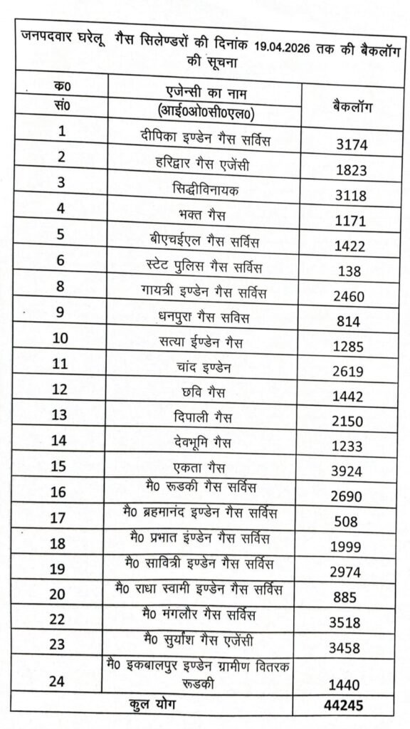 जनपद हरिद्वार में संचालित गैस एजेंसियों में चल रहे बैंकलॉग को समाप्त करने के लिए जिला पूर्ति अधिकारी ने घरेलू एलपीजी गैस की अतिरिक्त लोड उपलब्ध कराने के