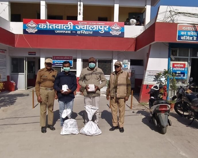 हरिद्वार, 17 नवम्बर। ज्वालापुर कोतवाली पुलिस ने दो शराब तस्करांे को गिरफ्तार किया है। आरोपियों के कब्जे से देशी और अंग्रेजी शराब के 100 पव्वे बरामद हुए हैं। एसएसपी के निर्देश पर शराब तस्करों के खिलाफ अभियान चलाते हुए पुलिस टीम ने चेकिंग के दौरान अलग-अलग स्थान से चिंटू पुत्र सतपाल निवासी राजीव नगर कॉलोनी आर्य नगर ज्वालापुर को देशी शराब माल्टा के 50 पव्वे व हरीश जौली पुत्र स्वर्गीय सिकंदर लाल निवासी शिवानीपुरम फेज-2 राजा गार्डन कनखल को अंग्रेजी शराब सोलमेट के 50 पव्वों समेत दबोच लिया। आरोपियांे के खिलाफ आबकारी अधिनियम के तहत मुकद्मा दर्ज किया गया है। पुलिस टीम में कांस्टेबल कपिल गोला, कांस्टेबल आलोक नेगी, कांस्टेबल रोहित कुमार व कांस्टेबल मनोज डोभाल शामिल रहे।