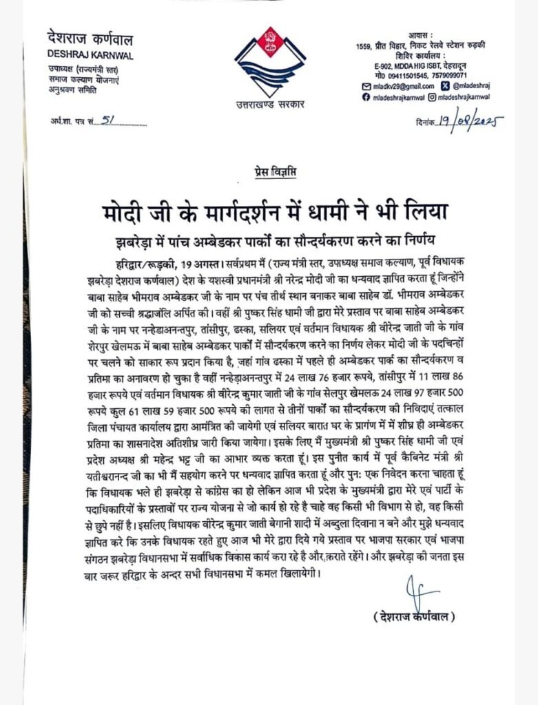 वहीं प्रदेश के यशस्वी मुख्यमंत्री श्री पुष्कर सिंह धामी जी द्वारा मेरे प्रस्ताव पर बाबा साहेब अम्बेडकर जी के नाम पर नन्हेडाअनन्तपुर, तांसीपुर, ढस्का, सलियर एवं वर्तमान विधायक श्री वीरेन्द्र जाती जी के गांव शेरपुर खेलमऊ में बाबा साहेब अम्बेडकर पार्को में सौन्दर्यकरण करने का निर्णय लेकर मोदी जी के पदचिन्हों पर चलने को साकार रूप प्रदान किया है, जहां गांव ढस्का में पहले ही अम्बेडकर पार्क का सौन्दर्यकरण व प्रतिमा का अनावरण हो चुका है, वहीं नन्हेड़ाअनन्तपुर में 24 लाख 76 हजार रूपये, तांसीपुर में 11 लाख 86 हजार रूपये एवं वर्तमान विधायक श्री वीरेन्द्र कुमार जाती जी के गांव सेलपुर खेमलऊ 24 लाख 97 हजार 500 रूपये कुल 61 लाख 59 हजार 500 रूपये की लागत से तीनों पार्कों का सौन्दर्यकरण की निविदाएं तत्काल जिला पंचायत कार्यालय द्वारा आमंत्रित की जायेगी एवं सलियर बारात घर के प्रागंण में में शीघ्र ही अम्बेडकर प्रतिमा का शासनादेश अतिशीघ्र जारी किया जायेगा। इसके लिए मुख्यमंत्री श्री पुष्कर सिंह धामी जी एवं प्रदेश अध्यक्ष श्री महेन्द्र भट्ट जी का आभार व्यक्त करता हूं। इस पुनीत कार्य में पूर्व कैबिनेट मंत्री श्री यतीश्वरानन्द जी द्वारा भी पूरा सहयोग करने पर धन्यवाद ज्ञापित करता हूं और पुनः एक निवेदन करना चाहता हूं कि विधायक भले ही झबरेड़ा से कांग्रेस का हो लेकिन आज भी प्रदेश के मुख्यमंत्री द्वारा मेरे एवं पार्टी के पदाधिकारियों के प्रस्तावों पर राज्य योजना से जो कार्य हो रहे है चाहे वह किसी भी विभाग से हो, वह किसी से छुपे नहीं है। इसलिए विधायक बेगानी शादी में अब्दुला दिवाना न बने और मुझे धन्यवाद ज्ञापित करे कि उनके विधायक रहते हुए आज भी मेरे द्वारा दिये गये प्रस्ताव पर सरकार एवं संगठन झबरेड़ा विधानसभा में सर्वाधिक विकास कार्य करा रहे है और कराते रहेंगे। और झबरेड़ा की जनता इस बार जरूर हरिद्वार के अन्दर सभी क्षेत्रों में आशीर्वाद देगी
