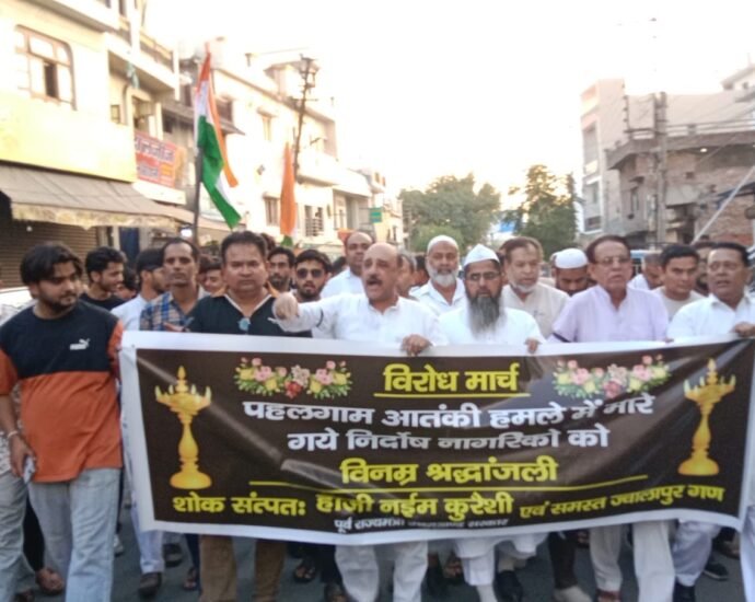 पूर्व राज्यमंत्री हाजी नईम कुरेशी के नेतृत्व में कसाबान पुलिया से दुर्गा चौक मुस्लिम समाज ने काली पट्टी बांधकर पाकिस्तान के खिलाफ विरोध मार्च निकाला। इस दौरान समाज ने पहलगाम हमले में मारे गए पर्यटकों को श्रद्धांजलि भी दी। इस मौके पर हाजी नईम कुरेशी ने कहा कि सरकार पाकिस्तान और आतंकवादियों पर सख्त कार्यवाही करे। निहत्थे पर्यटकों को स्थानीय लोगों पर आतंकवादियों ने गोली बरसाई जिसकी जितनी निंदा की जाए उतनी कम है। कुछ लोग देश के भाईचारे को नुकसान पहुंचा रहे हैं जिसे सफल नहीं होने दिया जाएगा। मौलाना आरिफ ने कहा कि जो भी दोषी हैं उनको पहचान कर मार गिराया जाए। पहलगाम के स्थानीय लोगों ने पर्यटकों की मदद भी की है। इस अवसर पर हाजी इरफान, युनुस अहमद, कारी शाहज़ेब, सलीम कुरेशी, अलीम कुरेशी, तामील कुरेशी, अरशद कुरेशी, शाहदाब, सैयद अंसारी, फहीम कुरैशी, लखन कुरैशी, आरिफ कुरैशी, तनवीर कुरेशी, मुन्ना कुरैशी, आसिफ कुरेशी, वसीम कुरेशी, रशीद अली, समीर प्रधान, आयरा कुरेशी, अयान कुरेशी, तारीफ कुरेशी, उमर फारुक, अजीम अली, नादिर अली, राशिद अली, असलम, सोनू आदि उपस्थित थे।